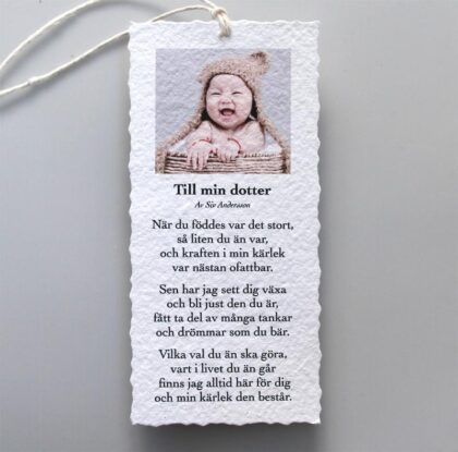 kortet har hål och snöre upptill så att de lätt kan fästas på en present, blombukett, flaska, eller hängas upp som ett minne.