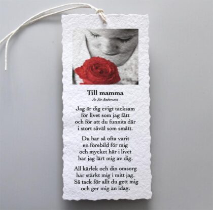kortet har hål och snöre upptill så att de lätt kan fästas på en present, blombukett, flaska, eller hängas upp som ett minne.
