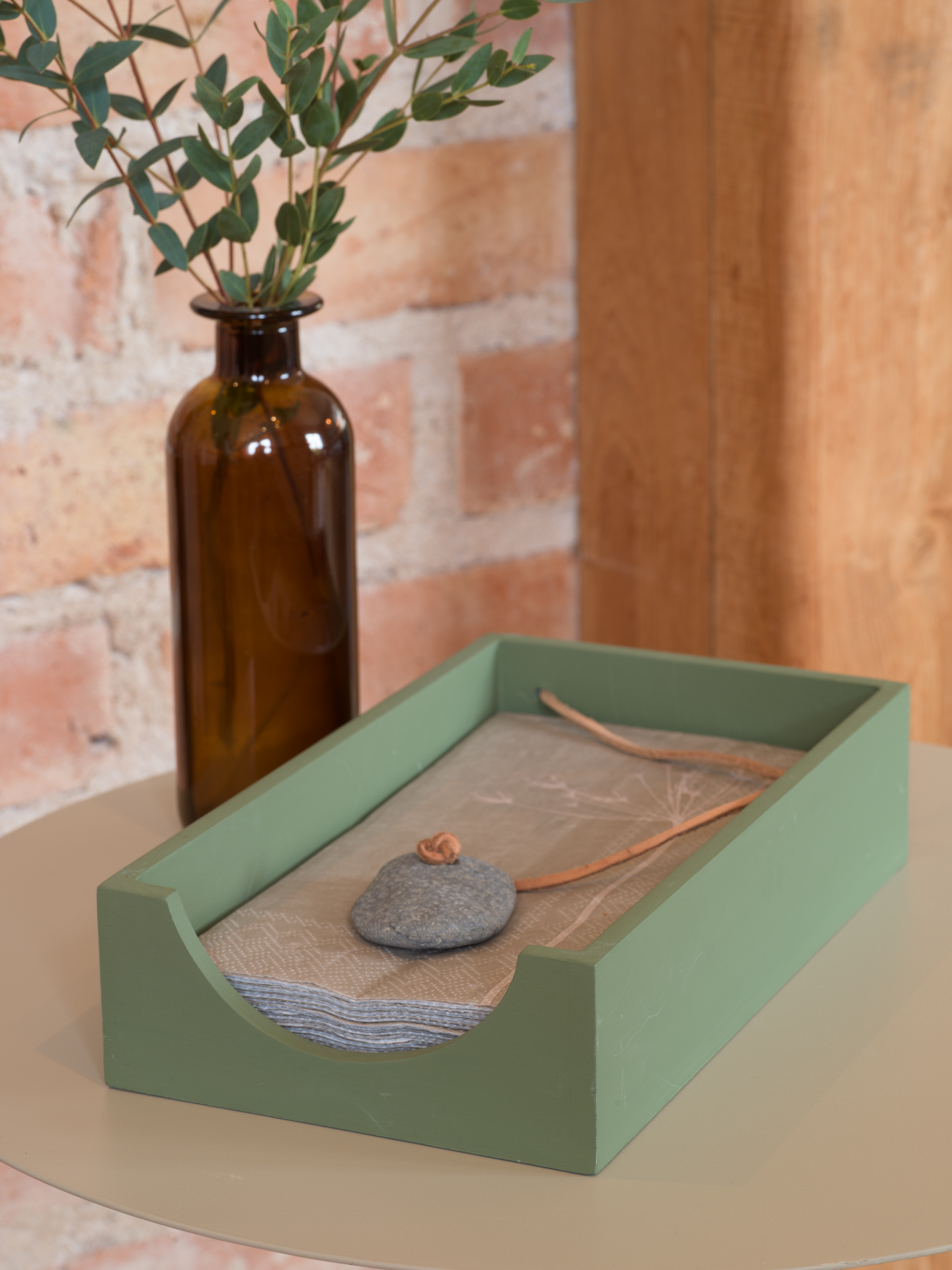 Grön servettlåda med sten.